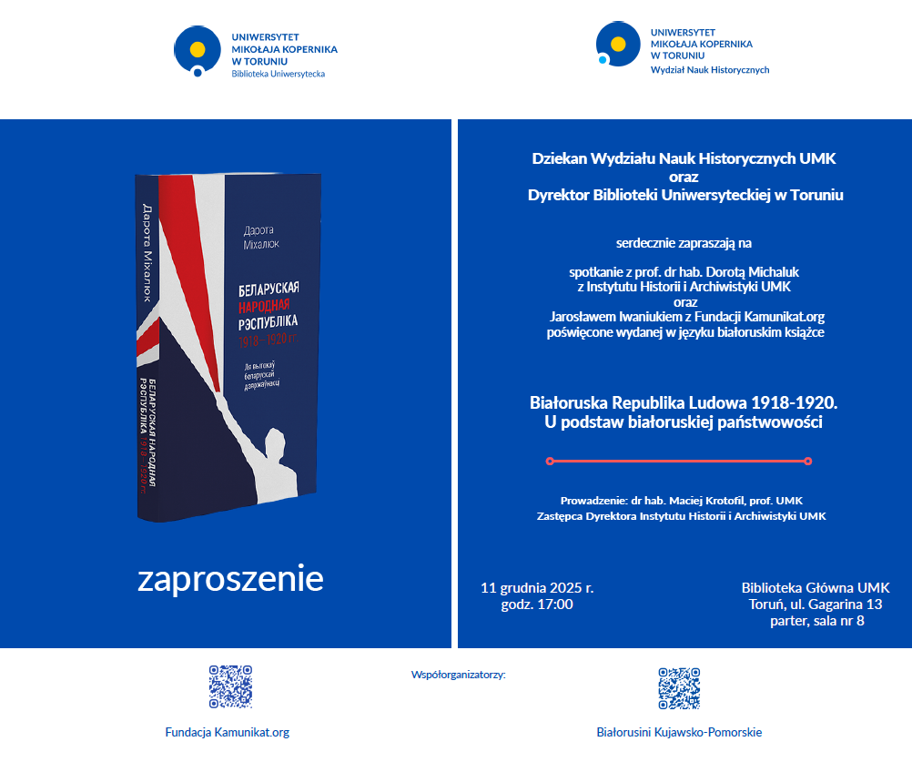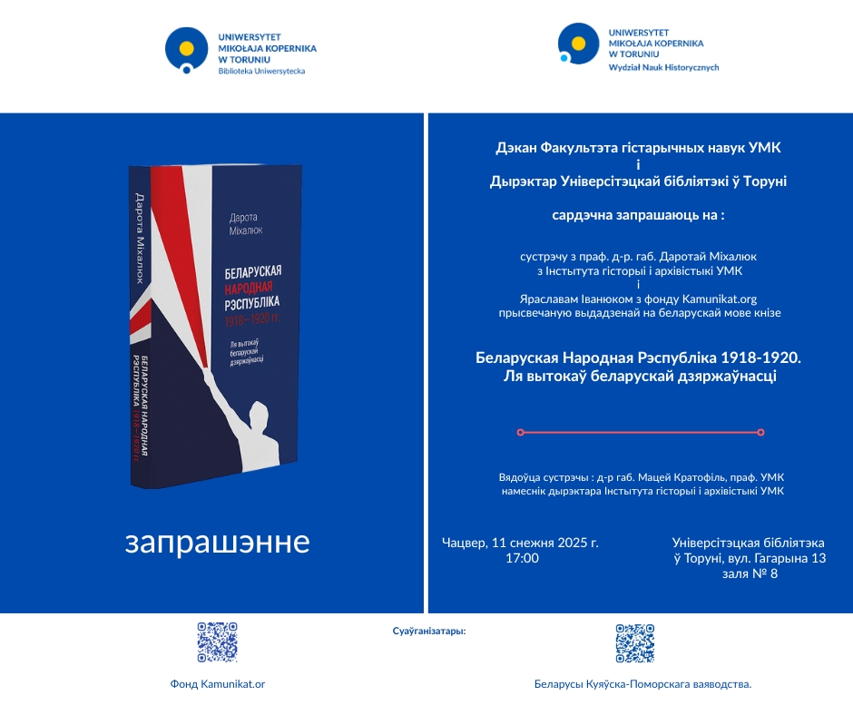 Дэкан Факультэта гістарычных навук УМК і Дырэктар Універсітэцкай бібліятэкі ў Торуні сардэчна запрашаюць на сустрэчу з праф. д-р. габ. Даротай Міхалюк з Інстытута гісторыі і архівістыкі УМК і Яраславам Іванюком з фонду Kamunikat.org, прысвечаную выдадзенай на беларускай мове кнізе Беларуская Народная Рэспубліка 1918-1920. Ля вытокаў беларускай дзяржаўнасці.