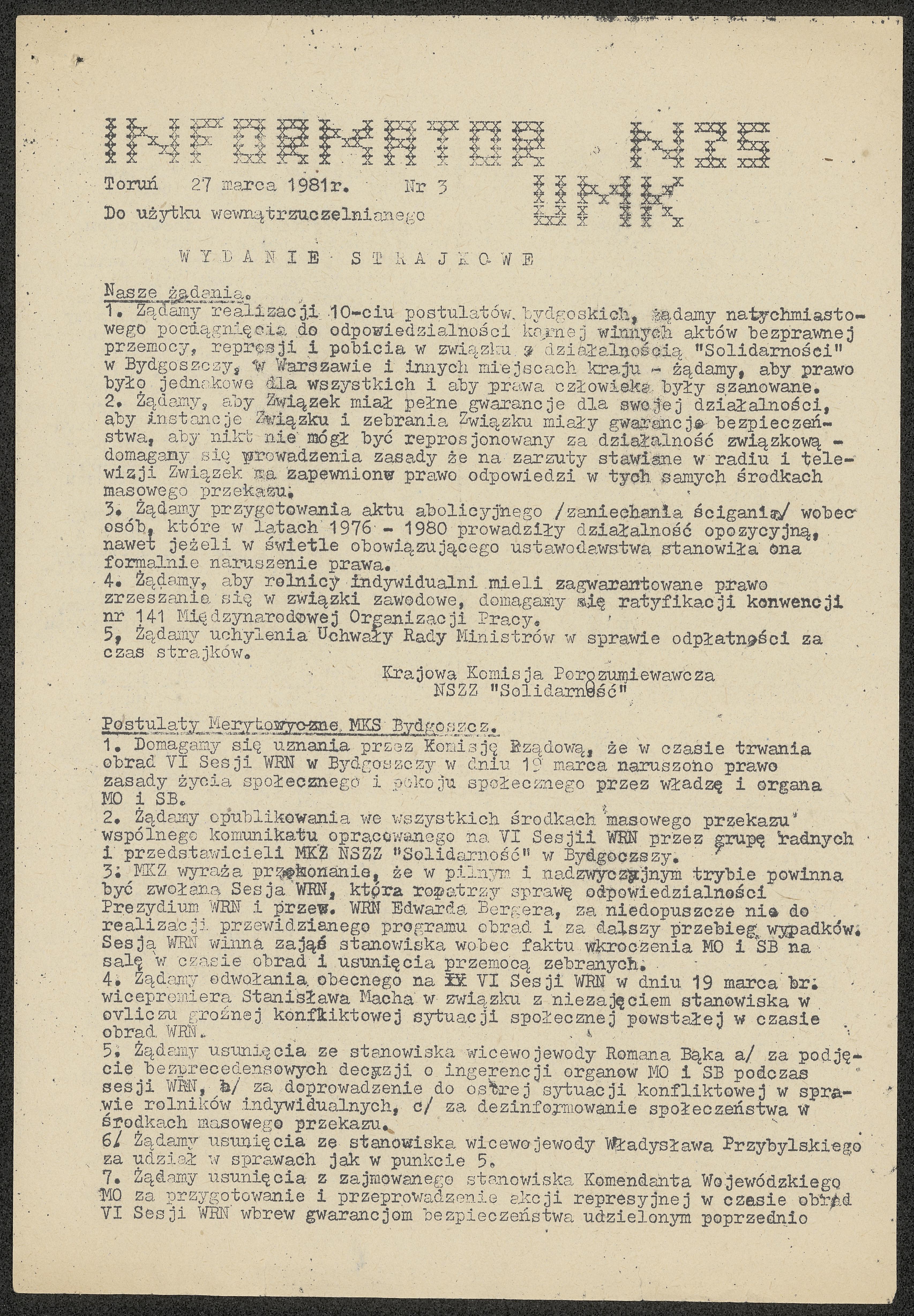 - strajk studencki z 17 lutego 1981 roku w budynku Instytutu Historii i Archiwistyki UMK, obecnie siedzibie Urzędu Marszałkowskiego;