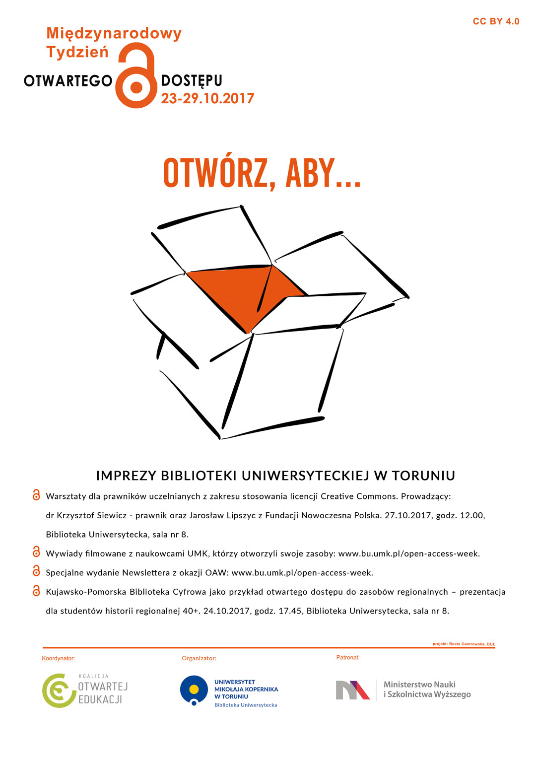 - Warsztaty dla prawników uczelnianych z zakresu stosowania licencji Creative Commons. Prowadzący: dr Krzysztof Siewicz - prawnik oraz Jarosław Lipszyc z Fundacji Nowoczesna Polska. 27.10.2017, godz. 12.00, Biblioteka Uniwersytecka, sala nr 8.